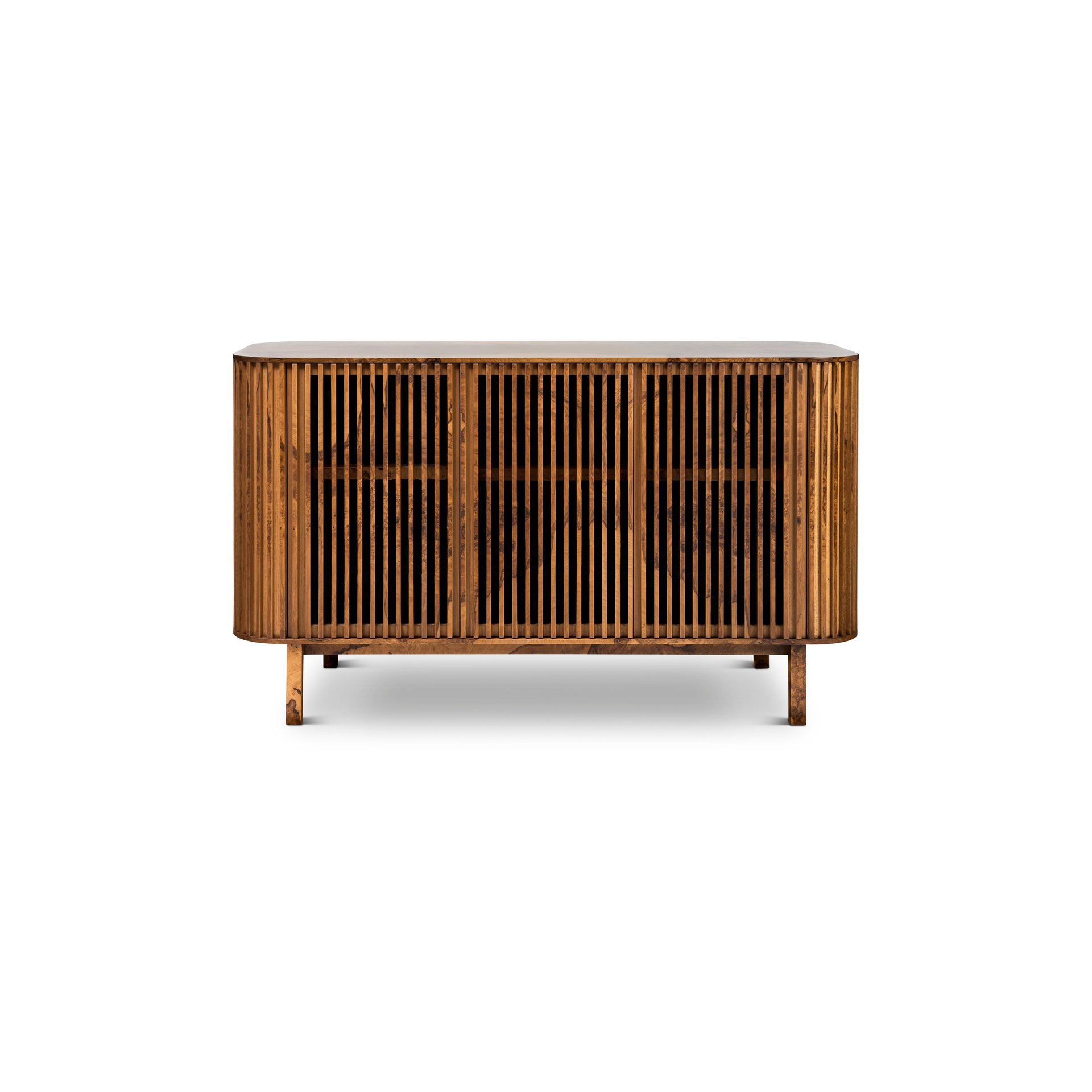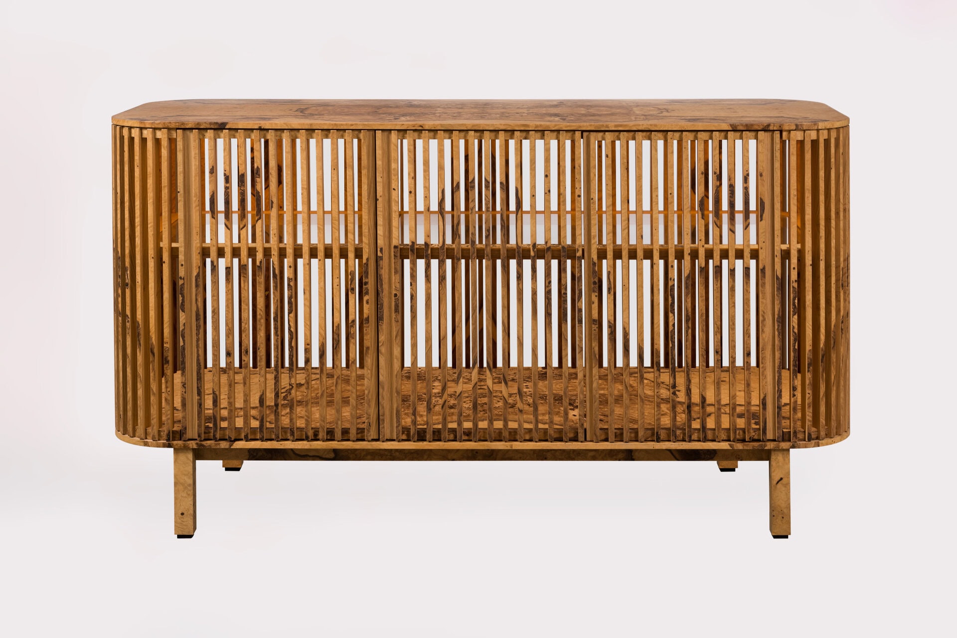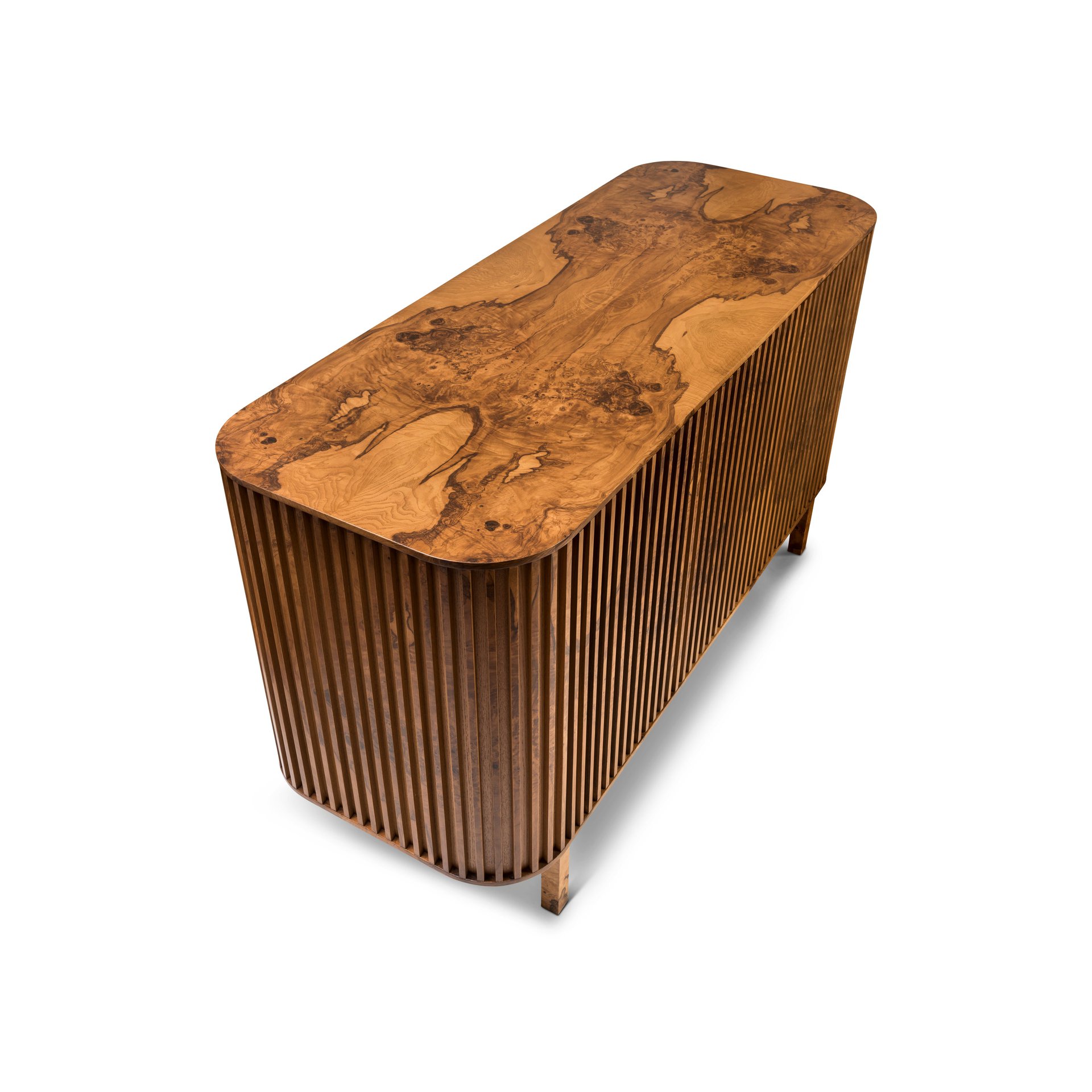 Bookmatched ash burl cabinet with exquisite wood, interior lighting and mirrored detail. *Made to order – Lead time 8-10 weeks