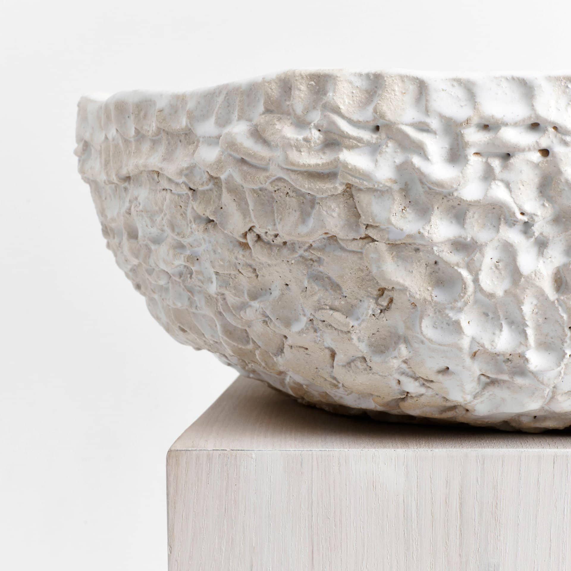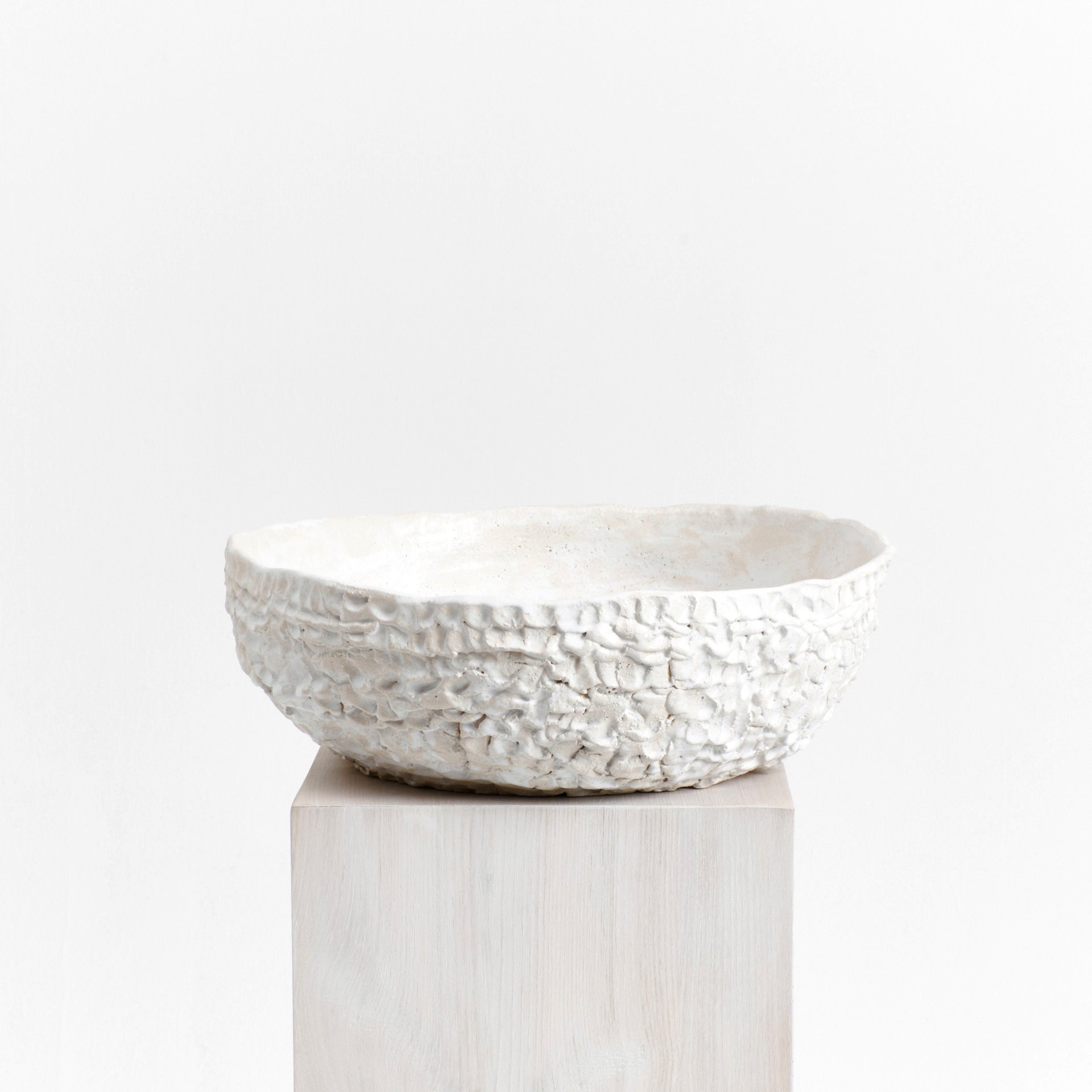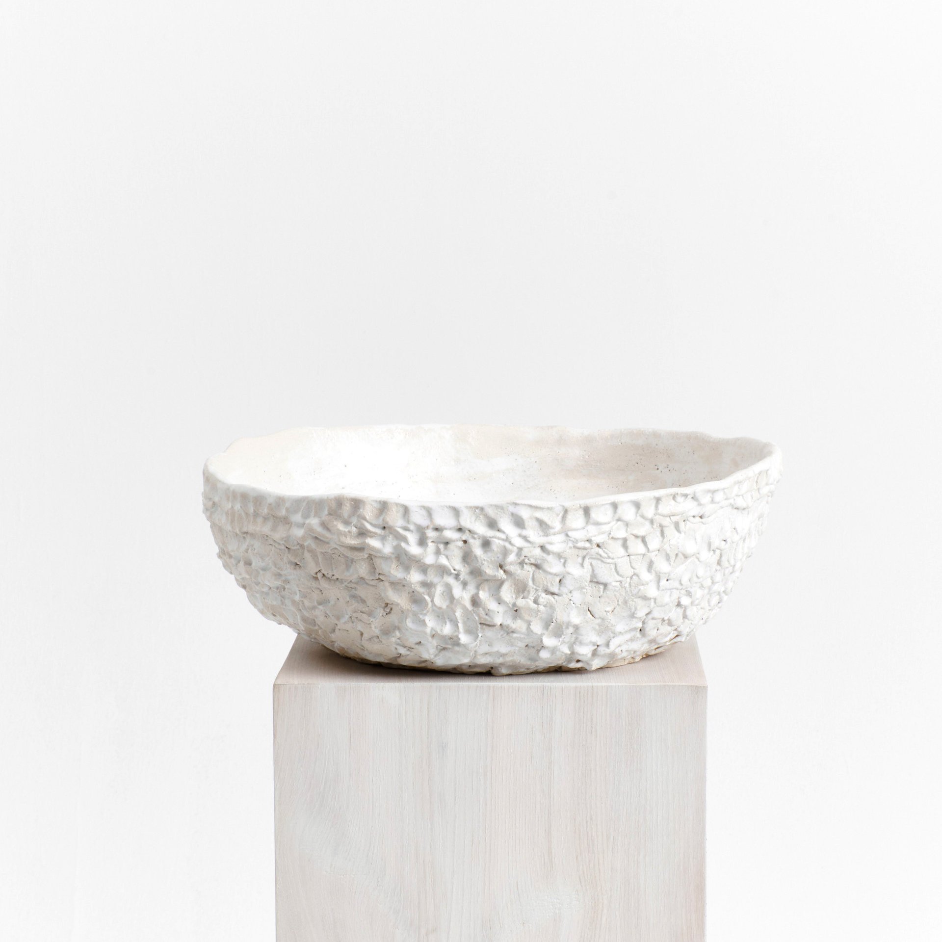 Artisanal large bowl created by skilled artisans in Project 213A’s own workshop. Hand-sculpted ceramic with a textured finish in white glaze. Each piece is unique due to its handmade nature, shapes and shades vary slightly.