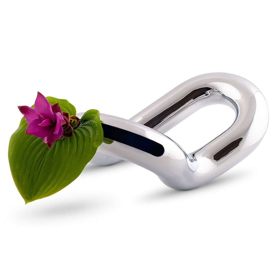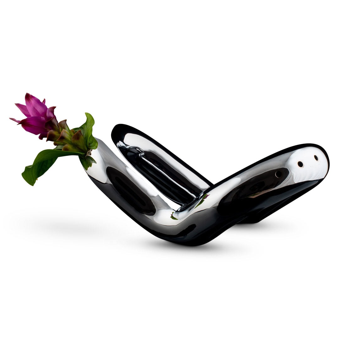 Cuore is a kinetic vase made out of an endless loop of chromed steel, polished to perfection. You can put a single flower or a whole bouquet to either of its ends. Slightly tap it to see it swaying from side to side reflecting the whole world in motion.