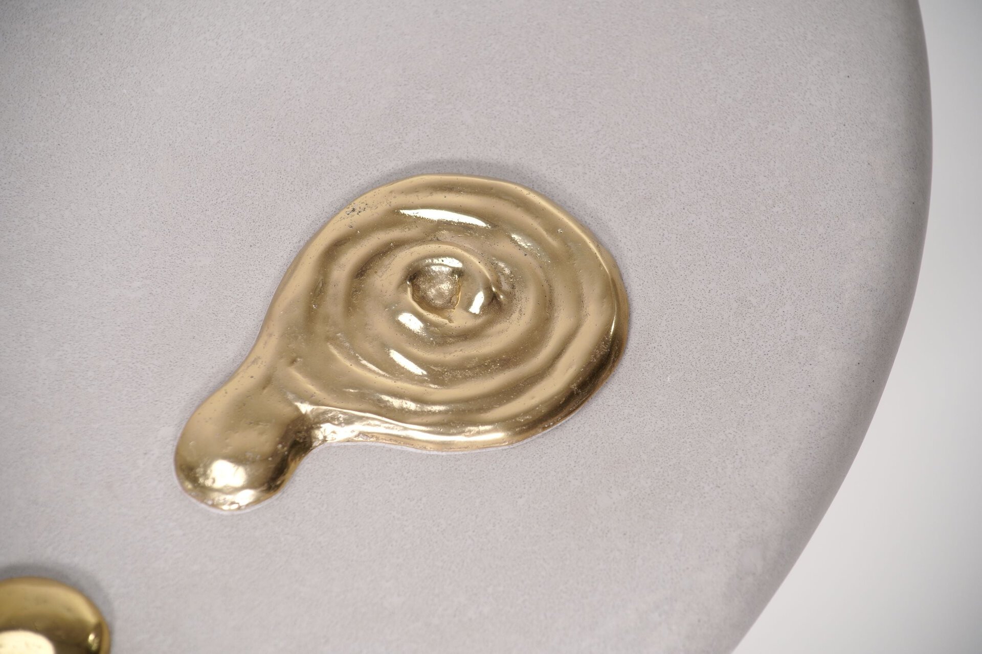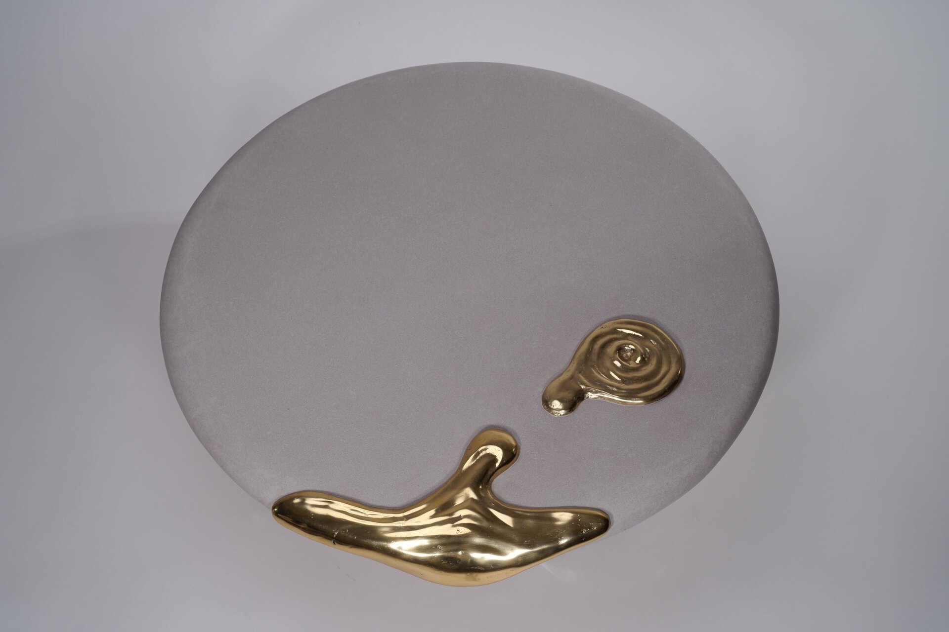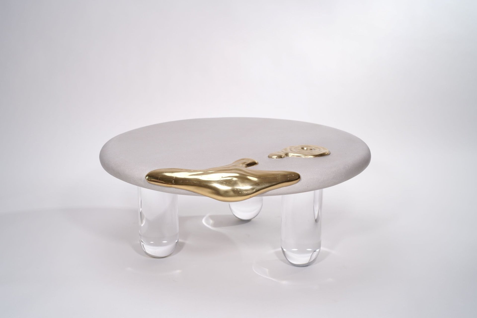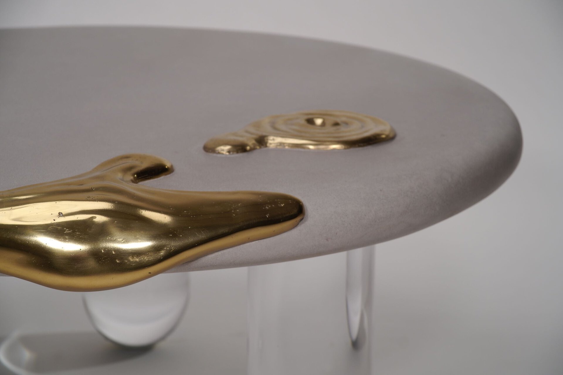 Featuring a grey sand-textured top adorned with a striking melted brass pattern that adds a touch of organic elegance. Supported by transparent acrylic legs, the table achieves a harmonious blend of modernity and timeless artistry. Crafted with pure brass, the intricate design will naturally develop a rich patina over time, enhancing its uniqueness and character. Available in custom sizes and finishes, this table is a versatile and sophisticated centerpiece for any room.