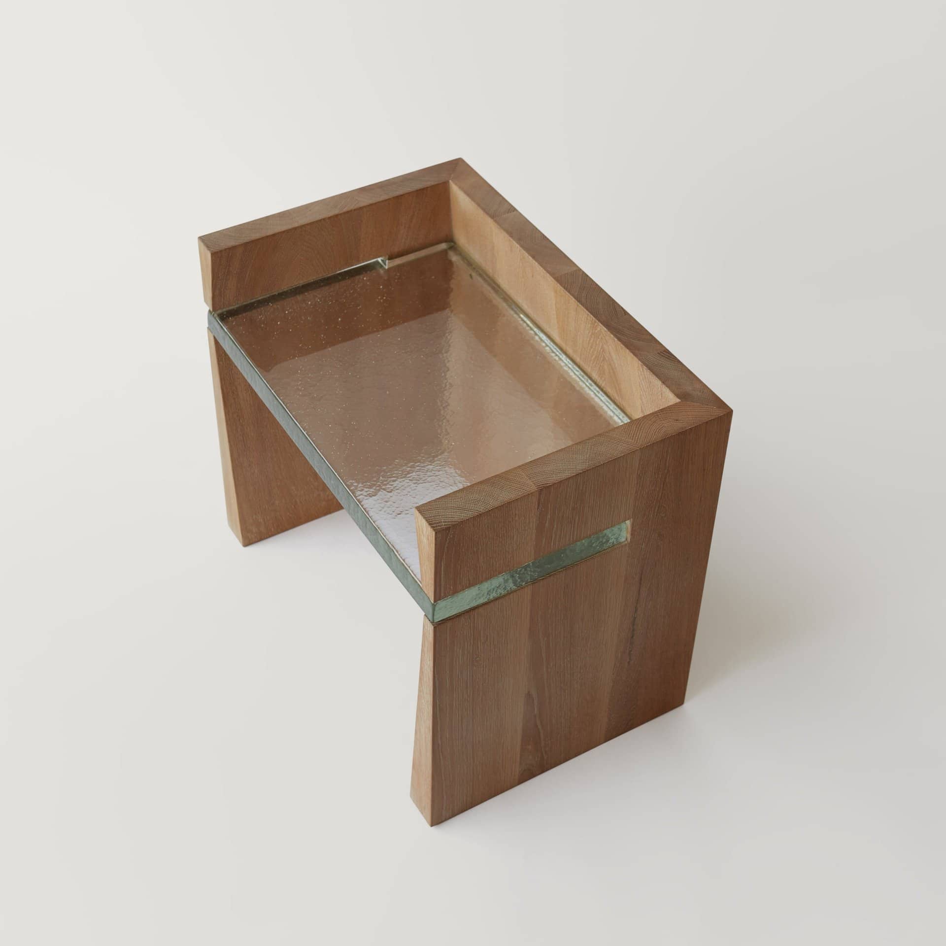 Equally functional and decorative with cast glass shelf, slicing through solid white oak frame, floating like a pool of water.