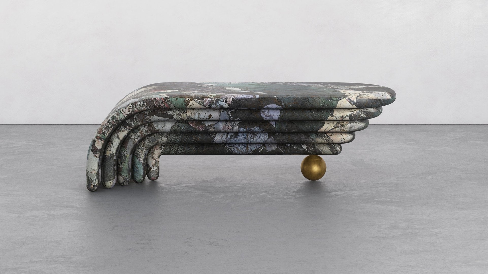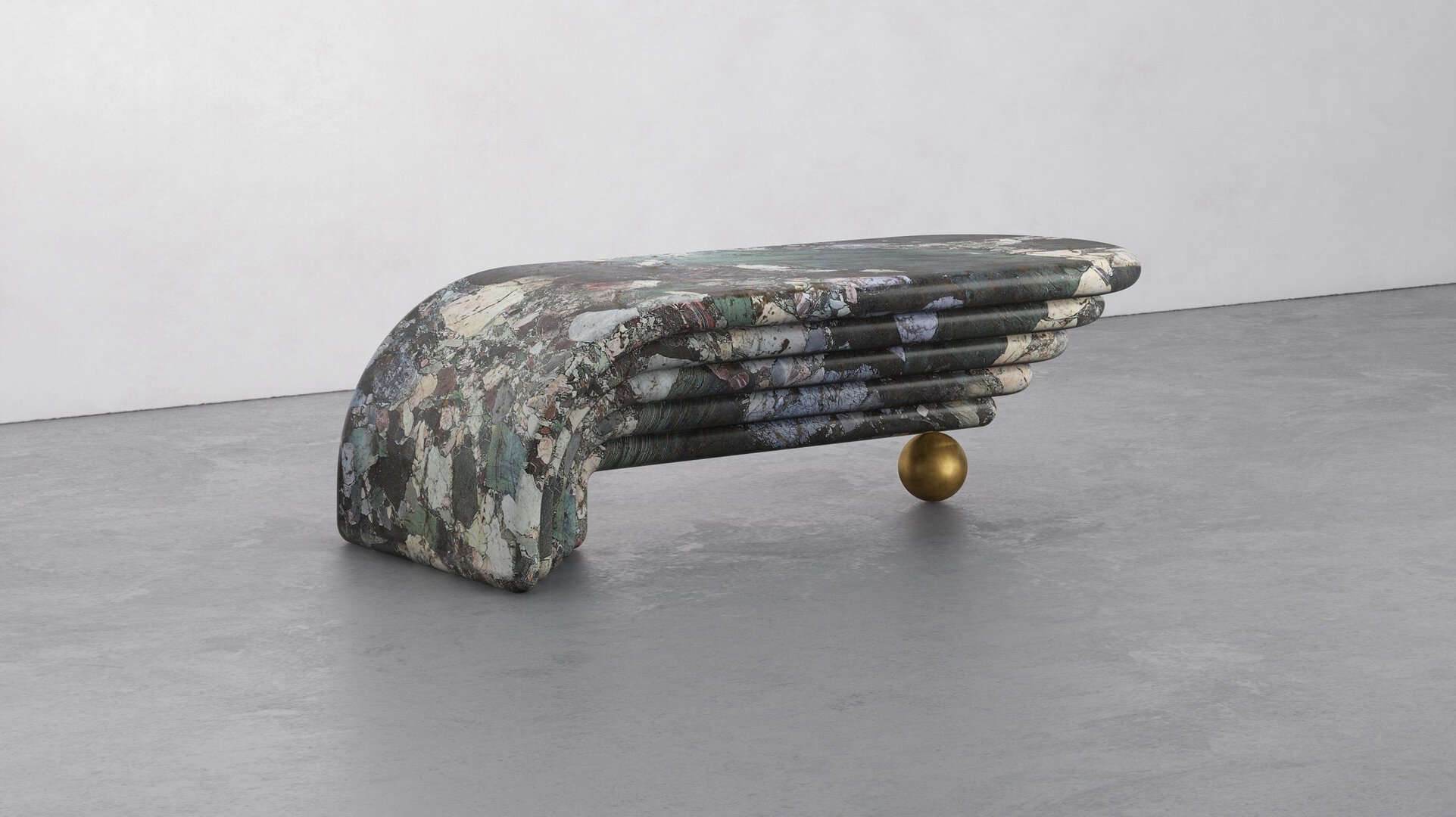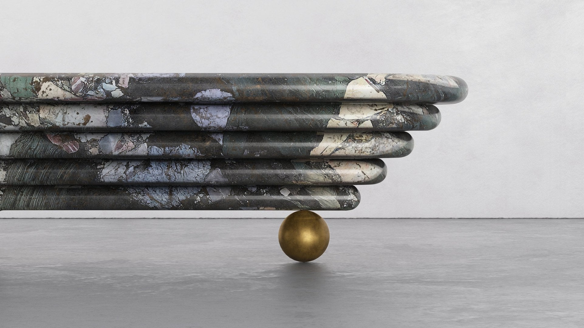 Coffee table in matte Arabescato Griggio & Brass. *Limited edition of 6, custom sizing and materials available – Lead time 14-16 Weeks
