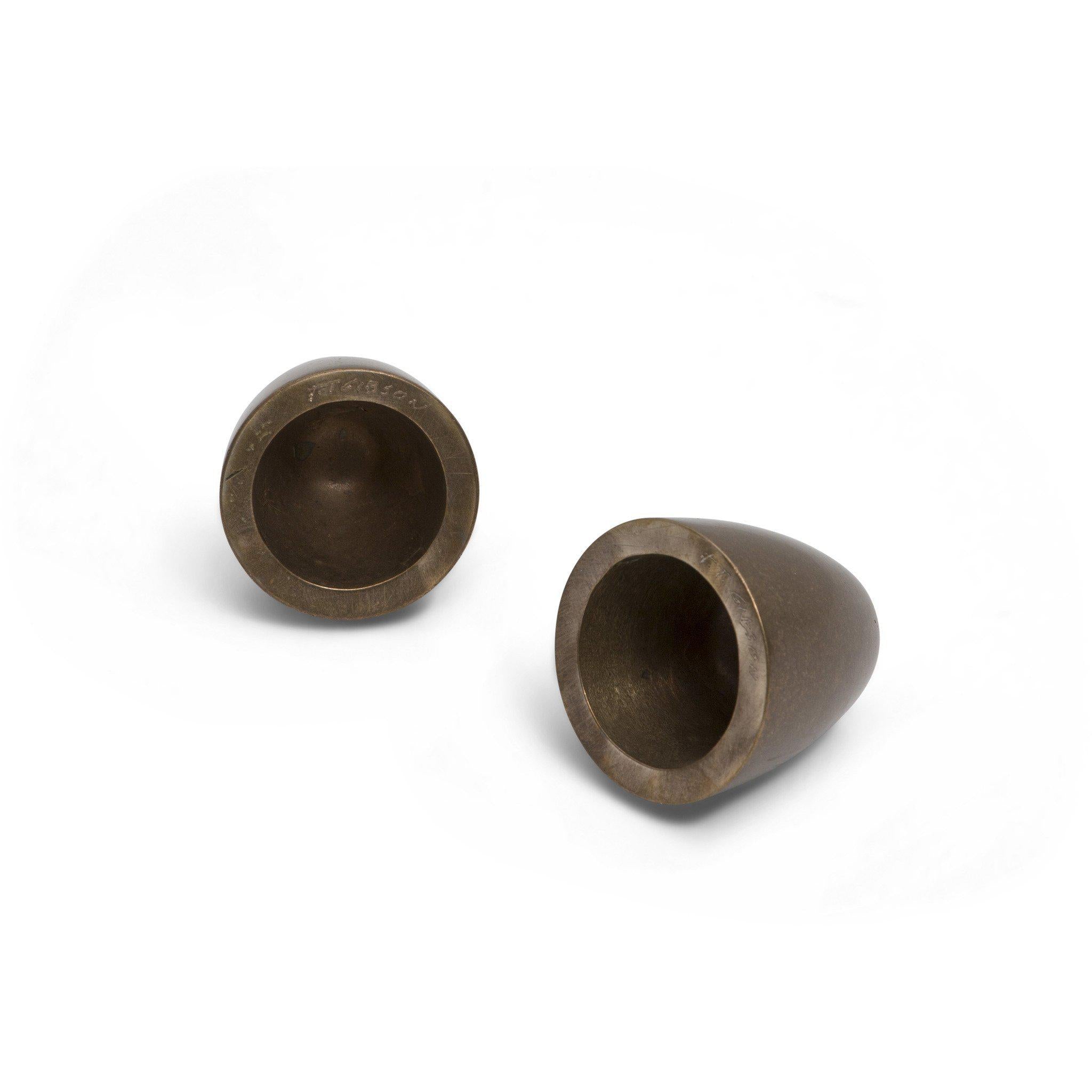Cast bronze “Frieda” candle holders by contemporary artist JT Gibson. Gibson explores artistic forms with his bronze works, presenting “Frieda” as a commanding piece for any table.  Their powerful forms compliment their surprising weight to leave a lasting impression. JT Gibson studied sculpture at Pratt Institute in the late seventies and learned the craft of fine art metal casting at the Johnson Atelier, a premier bronze art foundry. Thereafter, he founded Gibson Design, specializing in custom bronze metal work and his own furniture designs. His work has been commissioned by Peter Marino Architects, Chanel, Maya Lin and more.  In addition, he has maintained his practice as a contemporary artist and sculptor, exhibiting in museums and galleries nationwide. *Individually Priced