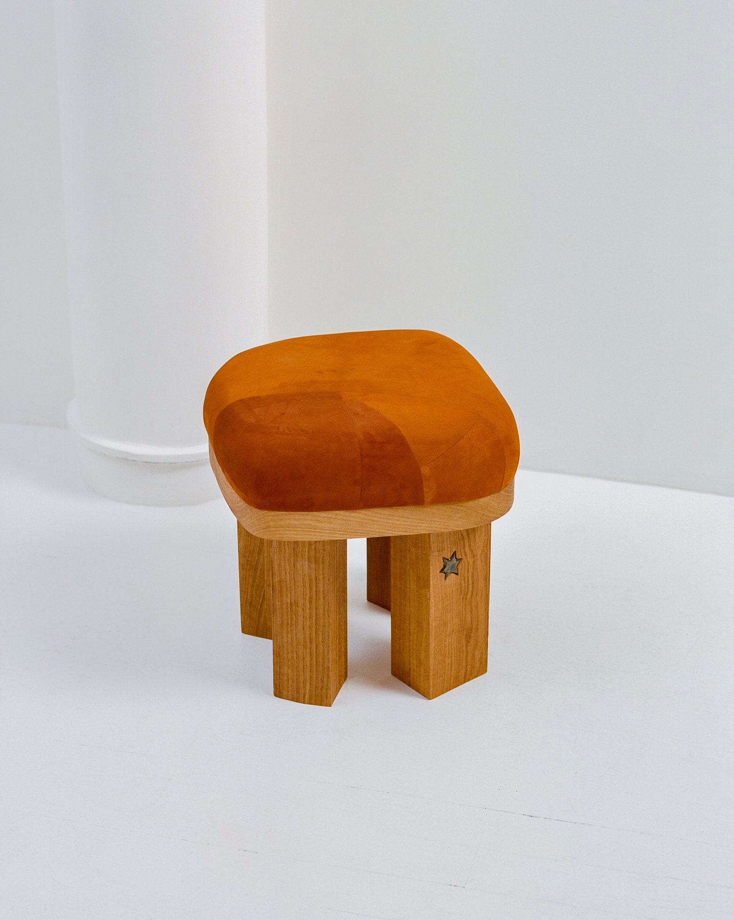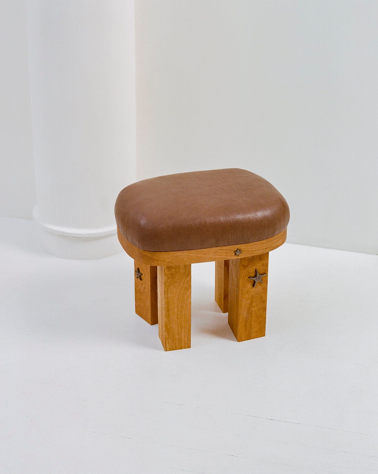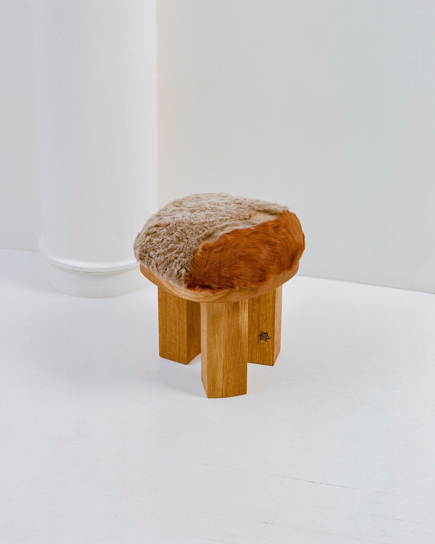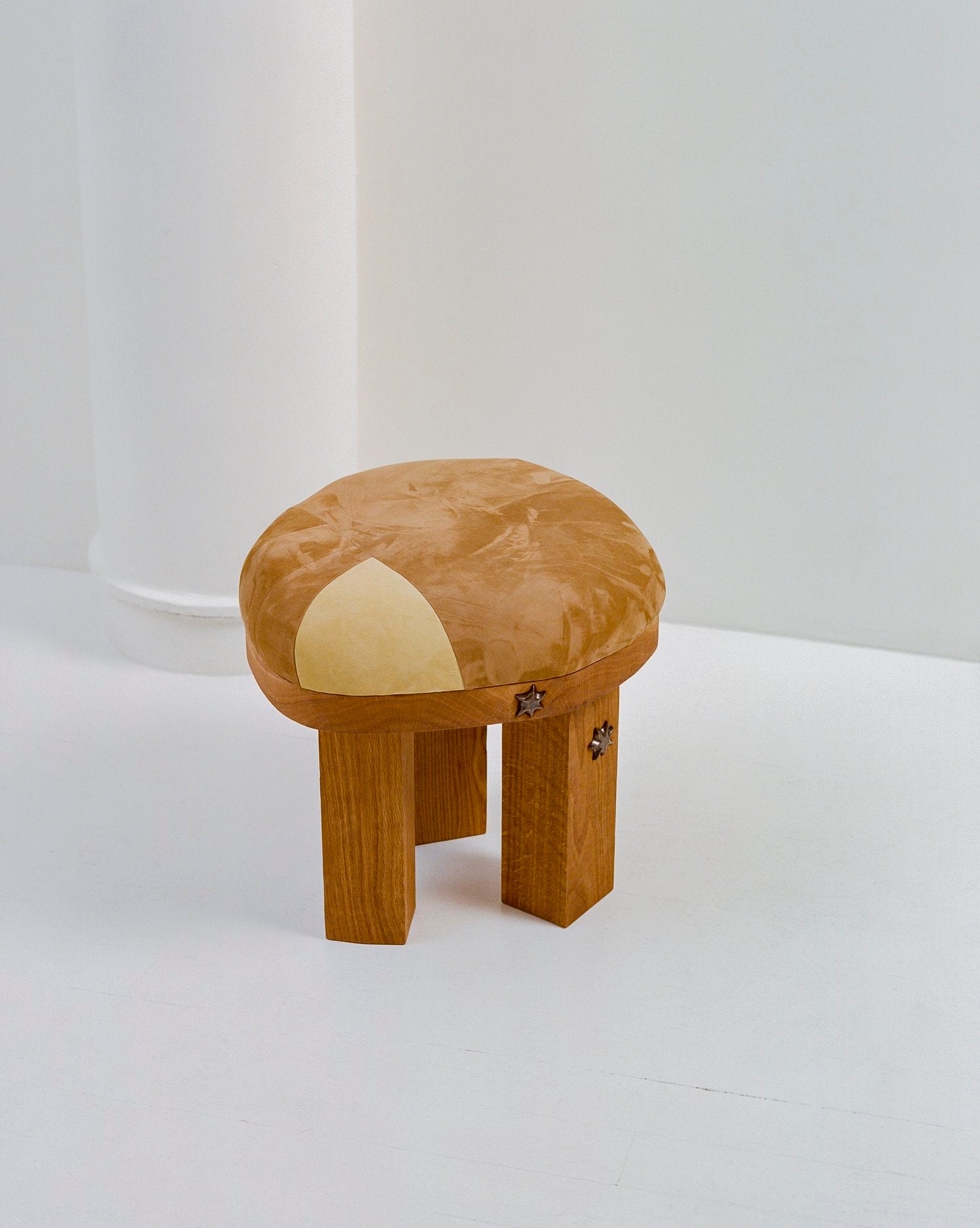 The Peb Stool has been handbuilt in wood and ceramic motifs. For upholstery, pieces of hide have been patched up according to the shape of the stool, making each piece unique. Inconsistency in texture, shape, and color may occur due to its natural material and firing procedures.