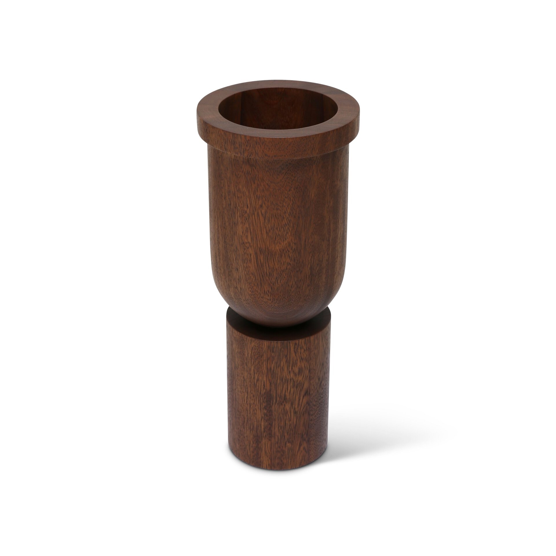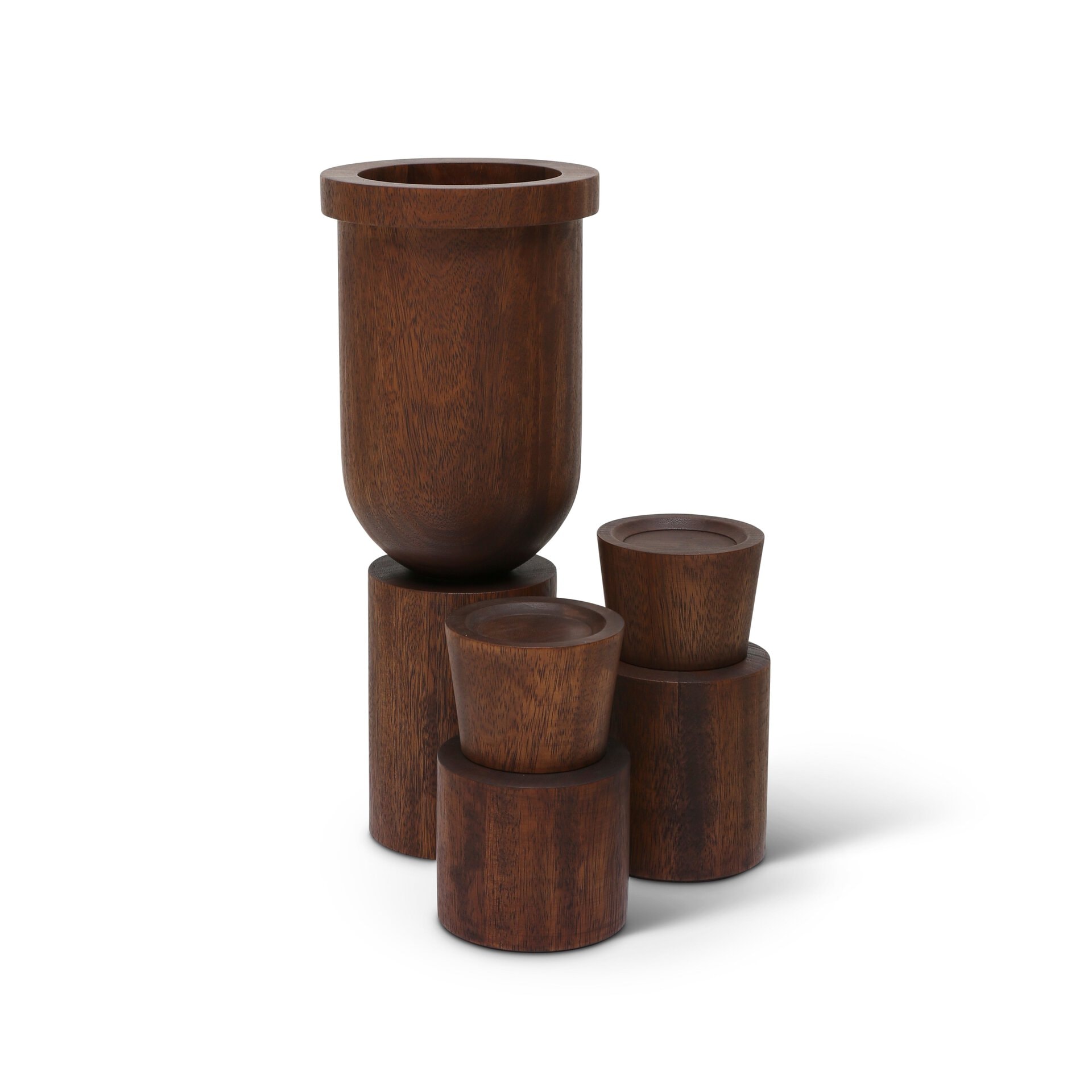 African Iroko Wood, natural pigmentations and oiled finish *Limited Edition 1 of 6 + 2 AP ABOUT THE ARTIST: At once rooted in tradition and embracing of new design languages, Studio ANANSI explores the beauty of blackness through collectible objects that deftly harmonize simplistic form and complex tactility. Debuting with a cohesive collection of bowls, platters, vessels, planters and a stool, Studio ANANSI presents a unique perspective on the history of black culture and craftsmanship. Meeting at the intersection of art and design, each piece is made from wood – chosen for its tactile and yielding nature – and revisits traditional craft in a thoroughly modern way. After being hand-turned, the sculpted objects undergo a specialized burning process that results in an appearance that manages to be both fluid and static, and one that intentionally conveys the struggles, events, love, loss, pain, suffering and – above all – beauty that the black body endures. “This collection is the first in a series intended to explore countless expressions of African diaspora and blackness through functional art objects. Their simple forms are rooted in African art, reimagined through a process that results in a textured, sculptural and vulnerable beauty that represents a visual narrative currently underrepresented in the world of design.” – Evan Jerry, Studio ANANSI