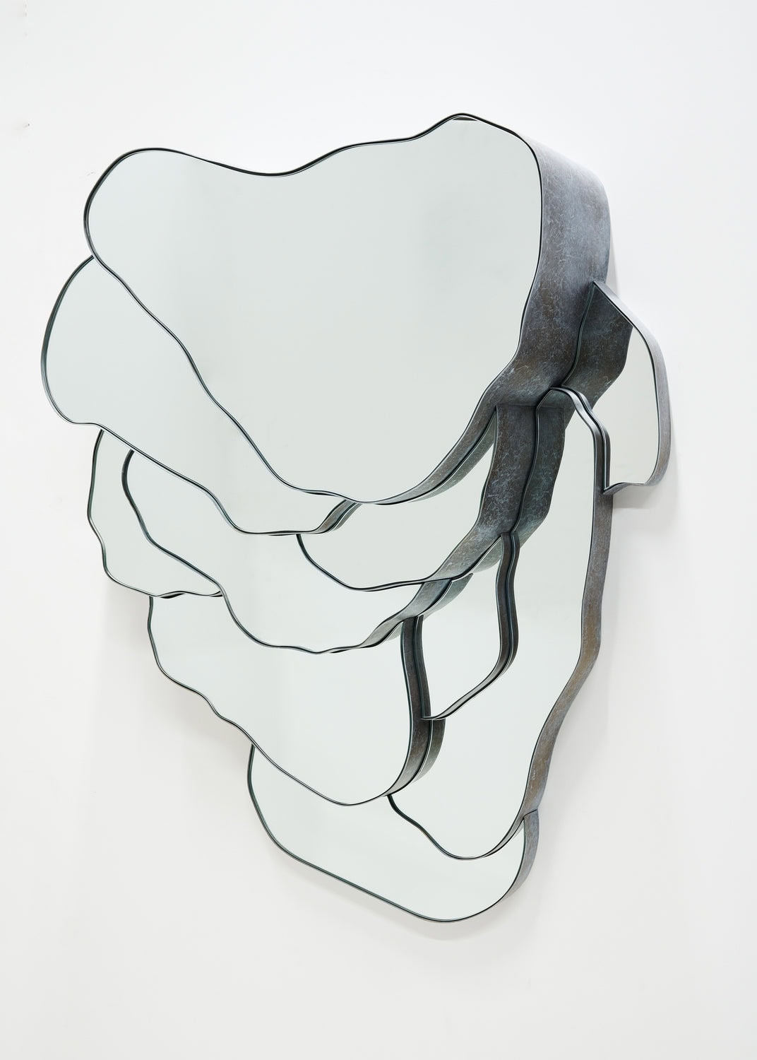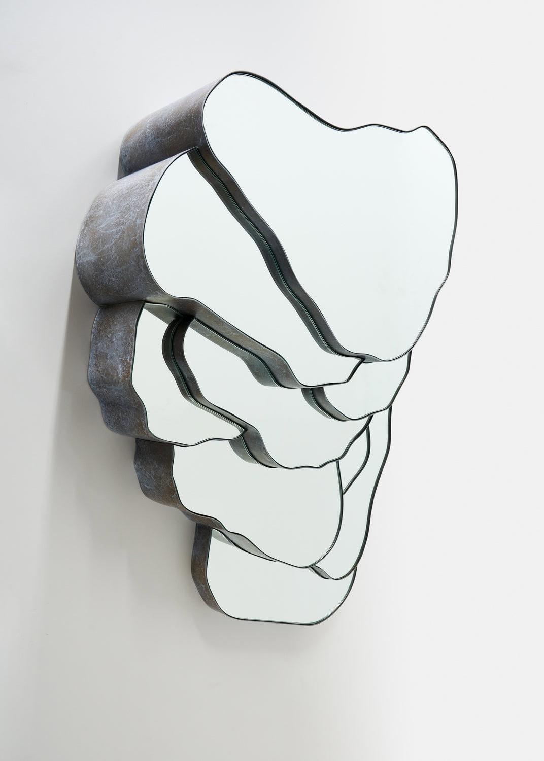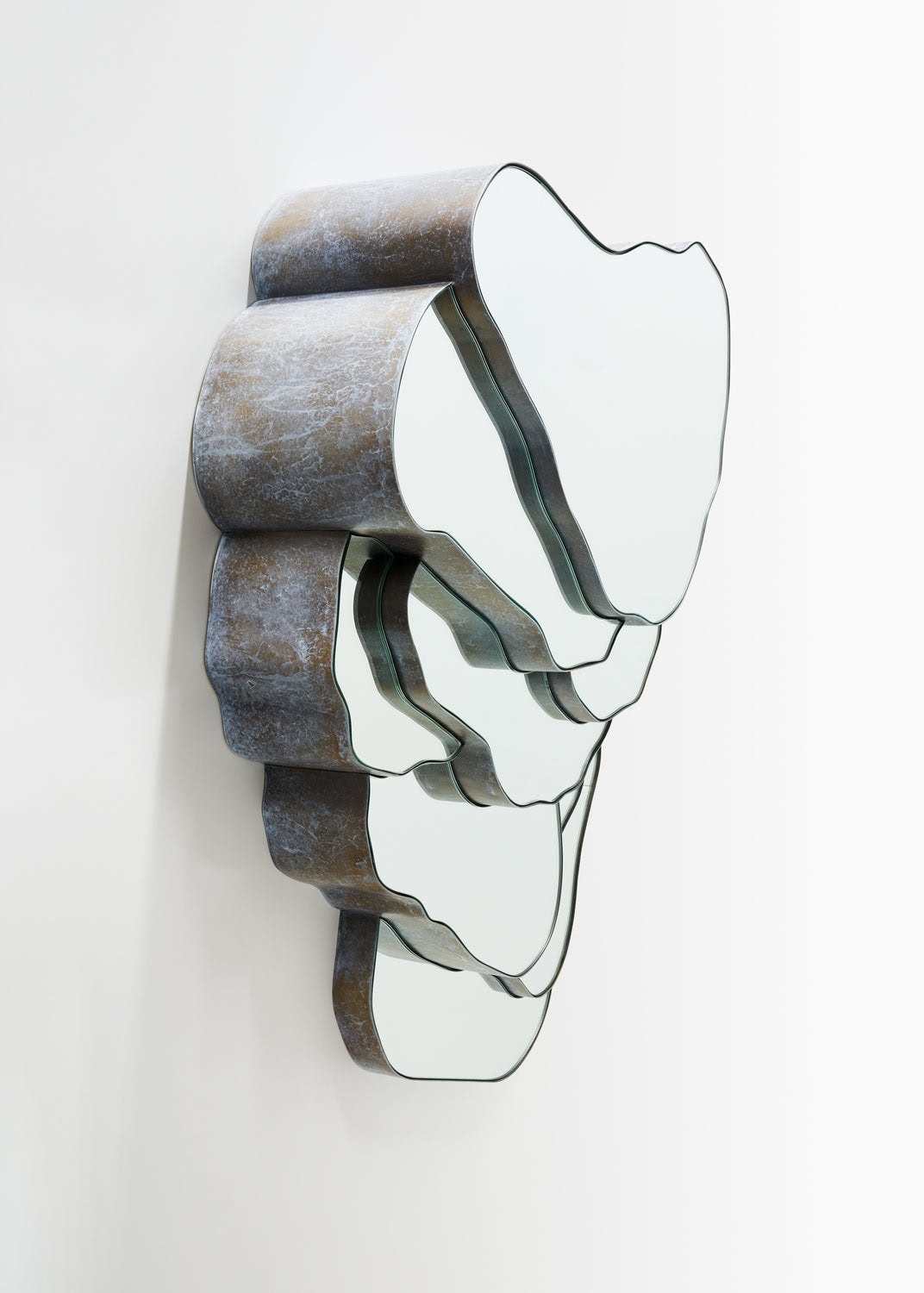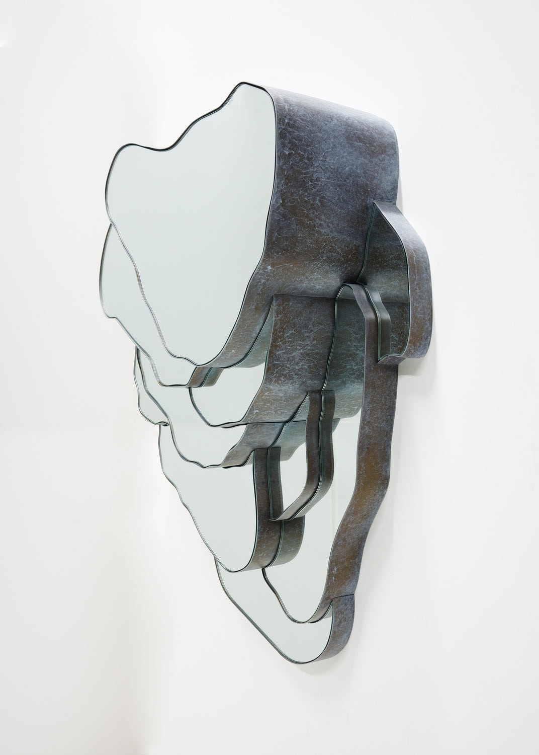 The Terrace Mirror drips down the wall, projecting a topography onto its planar surface. As with any topography, the nature of the mirror changes as we navigate around it, gaze into it from different perspectives. Straight on, our reflection is whole – but as we mo ve across it we see the brass edging begin to defy its own materiality, and we see our selves fragment, splinter into pieces and scatter across the room. We no longer see our selves, only pieces of our selves dispersed across the time and space.