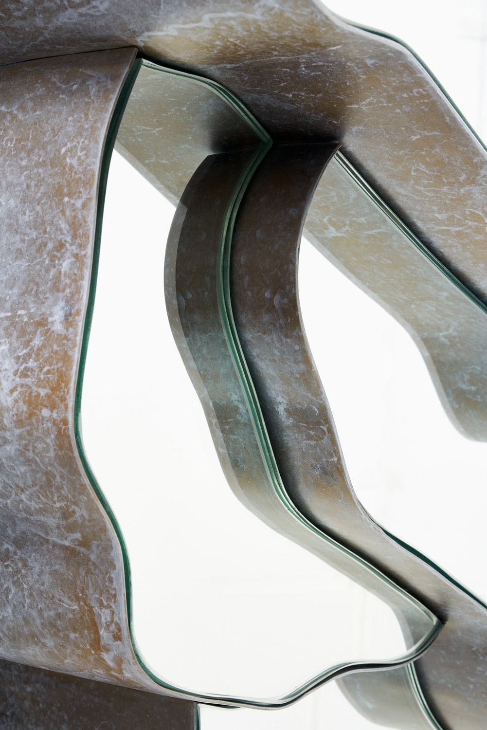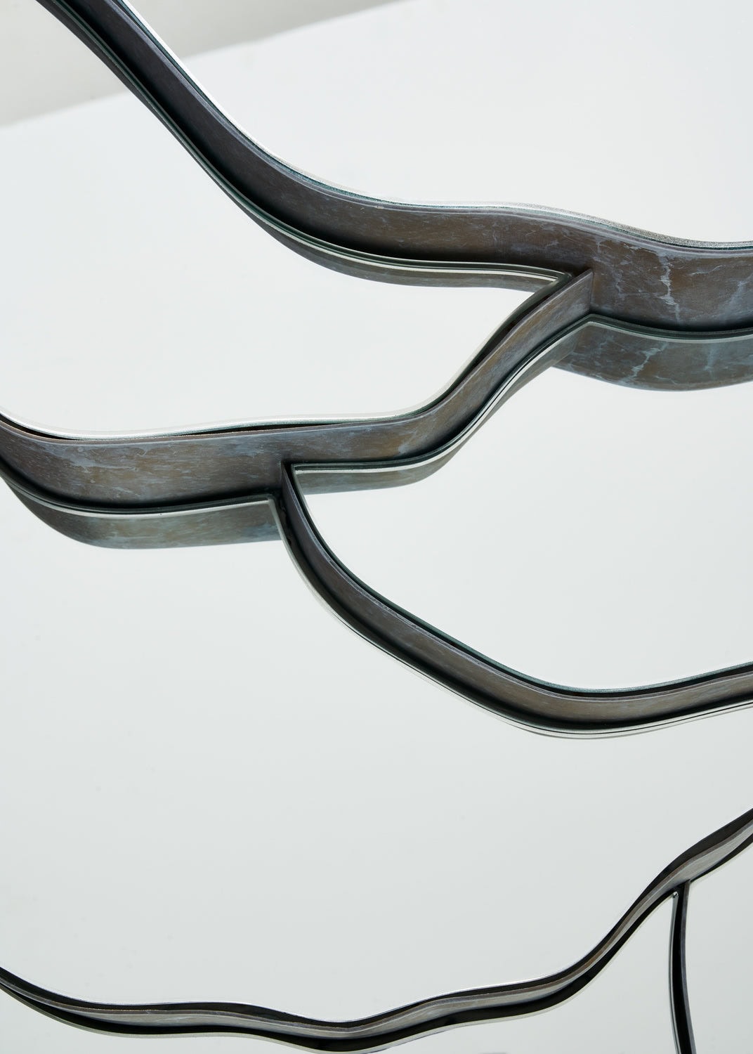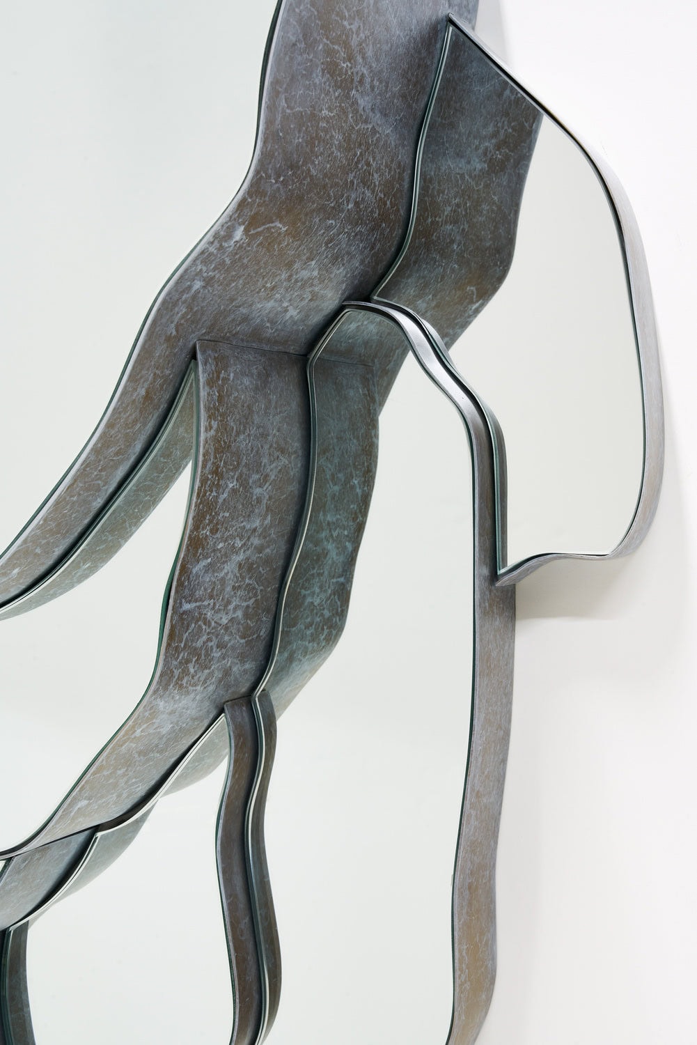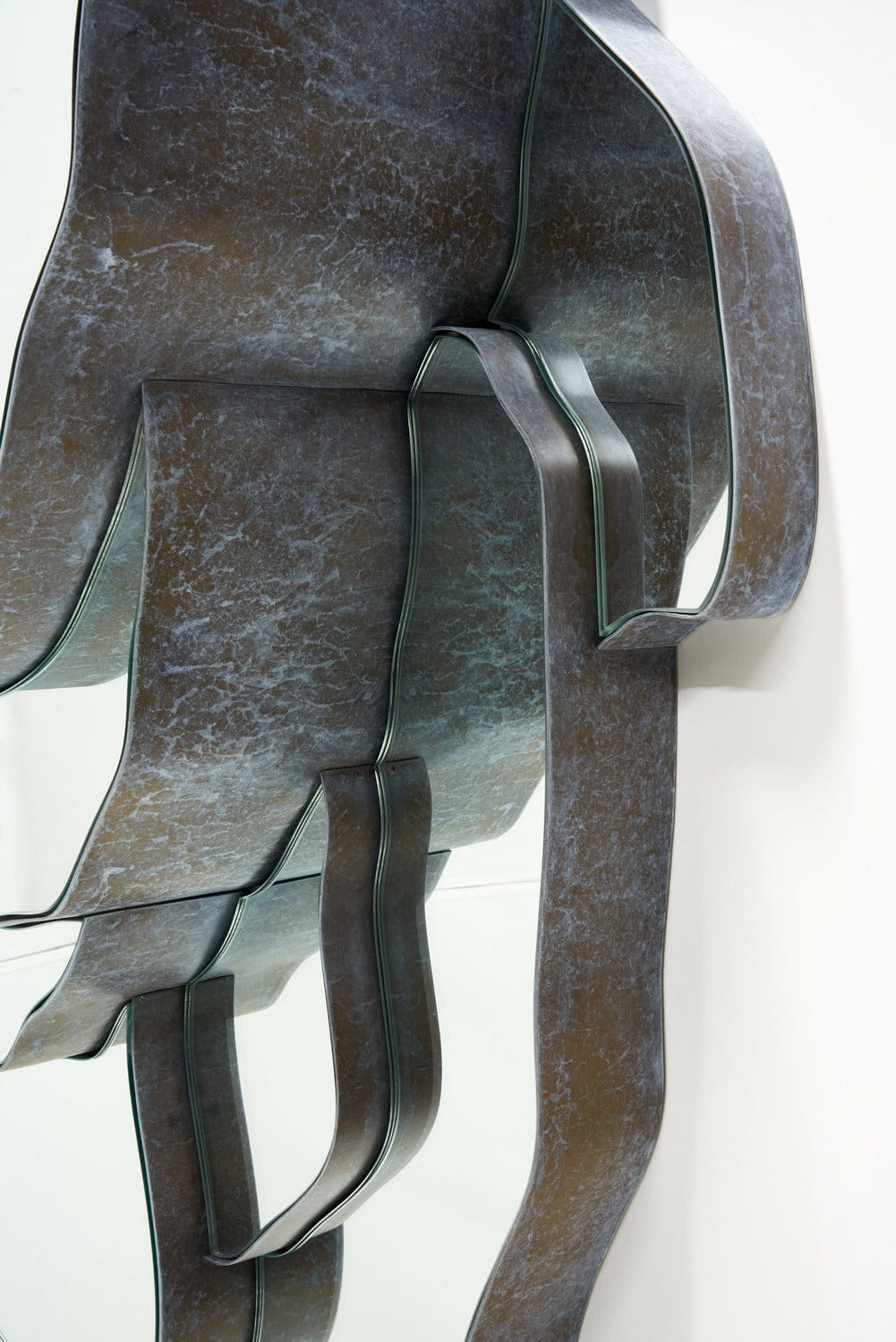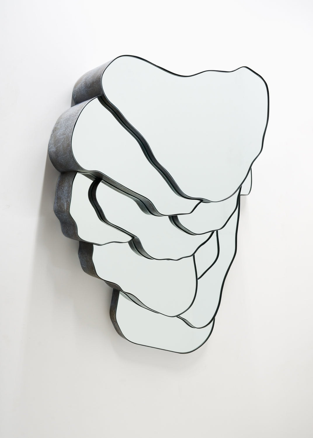The Terrace Mirror drips down the wall, projecting a topography onto its planar surface. As with any topography, the nature of the mirror changes as we navigate around it, gaze into it from different perspectives. Straight on, our reflection is whole – but as we mo ve across it we see the brass edging begin to defy its own materiality, and we see our selves fragment, splinter into pieces and scatter across the room. We no longer see our selves, only pieces of our selves dispersed across the time and space.