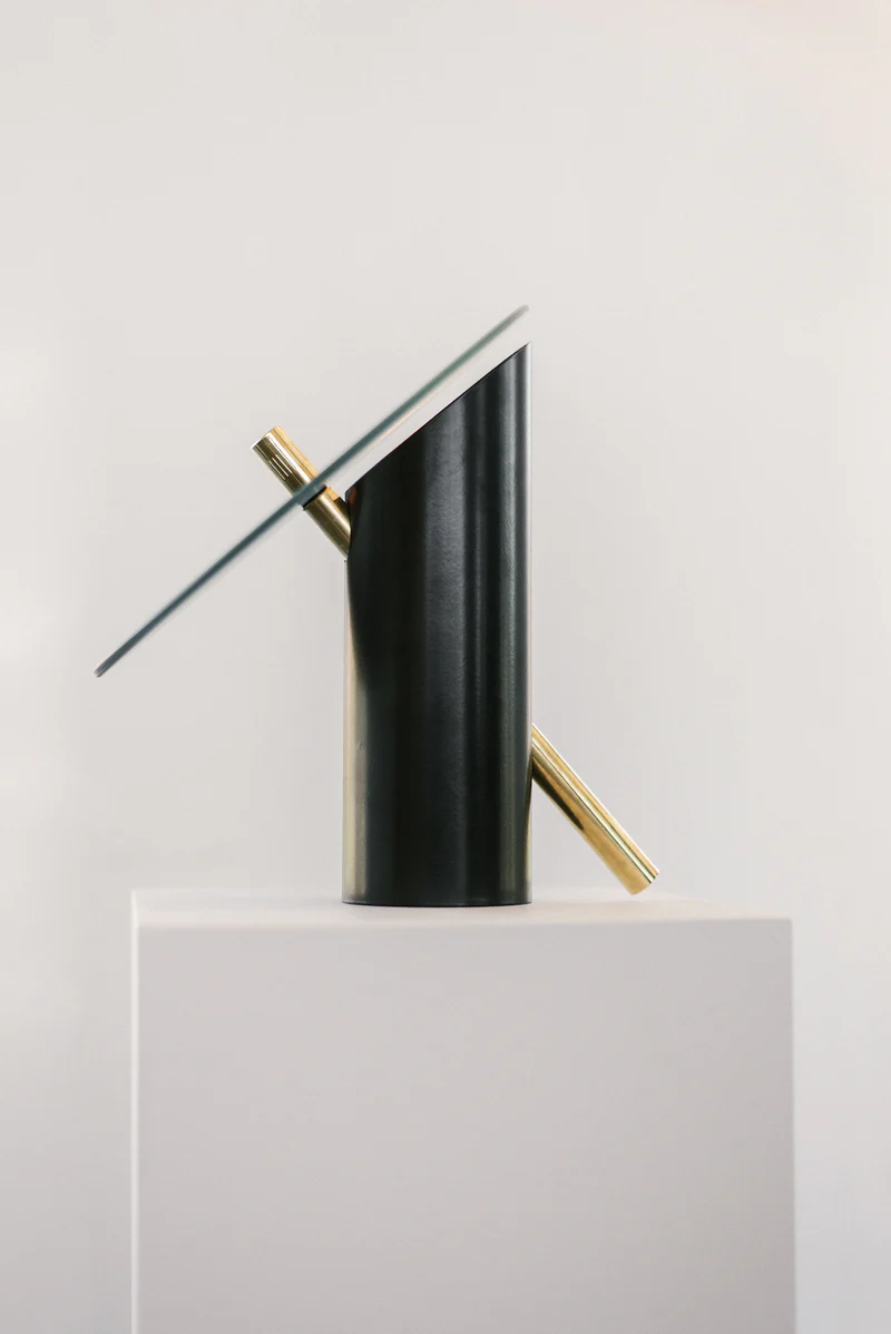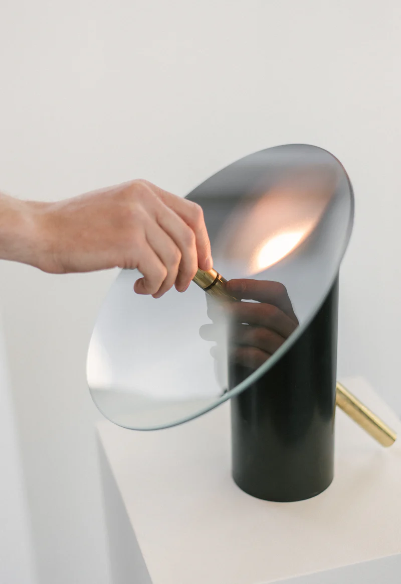 Inherent in its design, the tinge series draws the user to the source of light. The spinning brass knob controls the position of the tinted glass disk, which when spun manually changes the brightness of the light. The analog experience of the tinge lamp and wall sconce invites the connection between human, environment, and design, rendering app technology inessential for a brief moment in the day.
