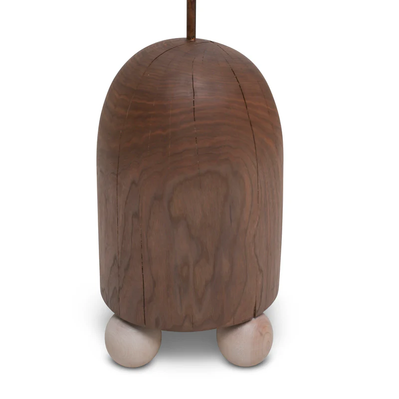 The Willow floor lamp is a perfect combination of slender elegance and sheer mass. The hand-shaped black walnut base comes from a tree that fell from a neighbor on to the designer’s property in Athens, New York. The base rests on four hand-turned 4″ diameter hard maple spheres. The neck of the lamp is made of copper with an authentic patina that comes only from being aged in the elements for an extended period of time — in this case three years. The shade of the lamp is 10″ diameter and made from slip-cast porcelain.